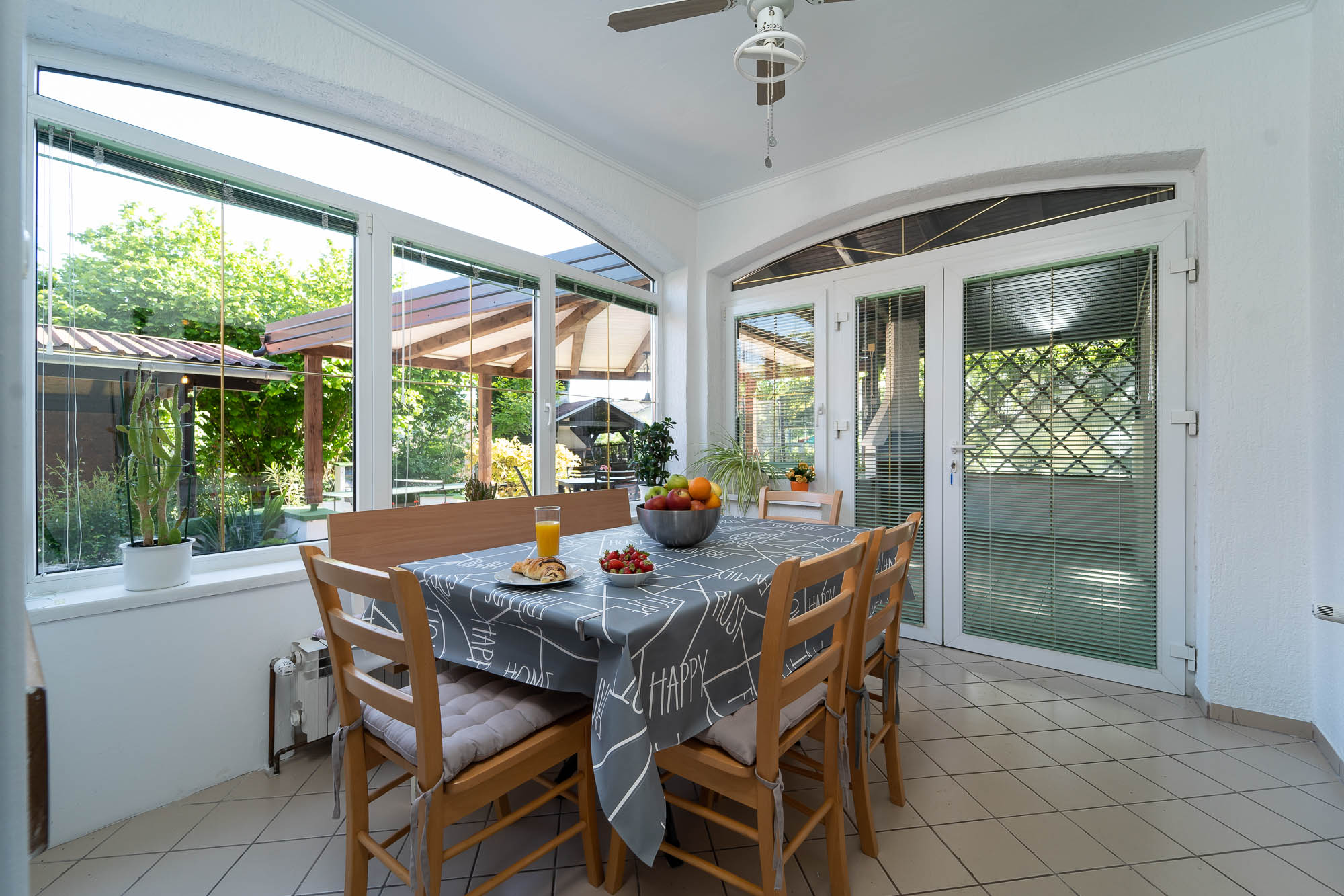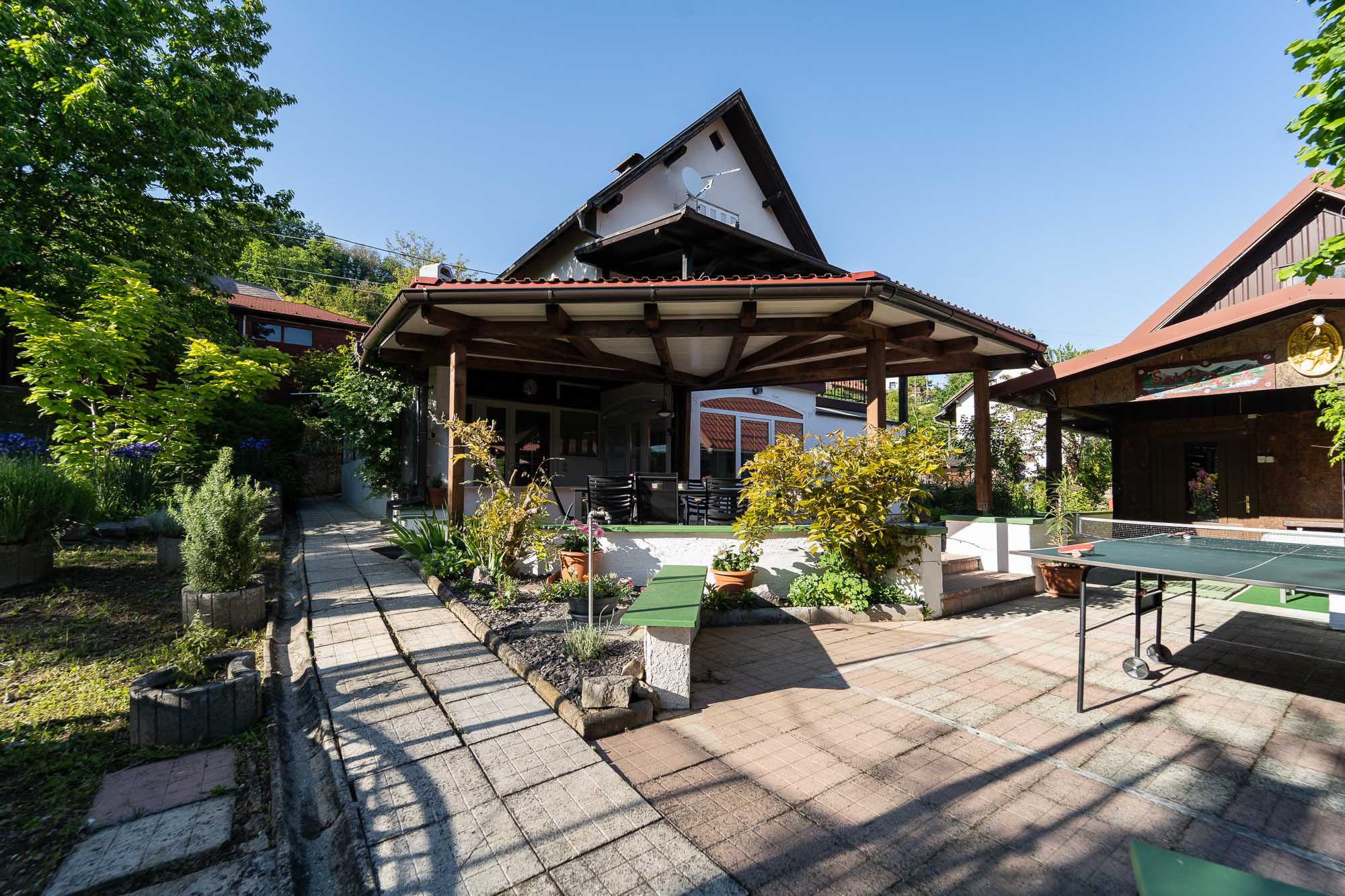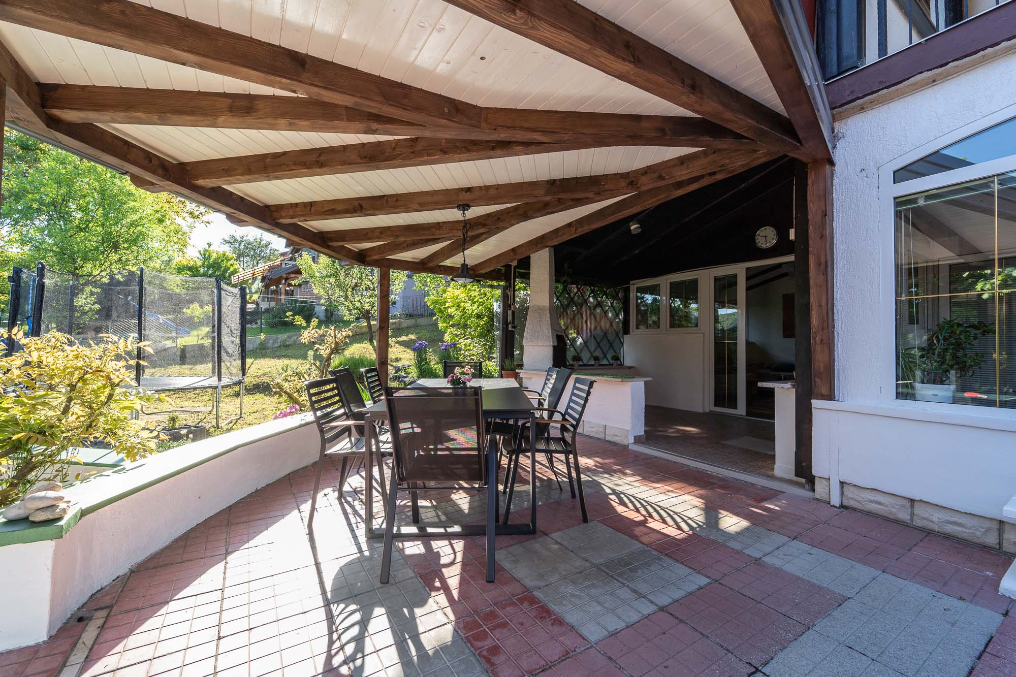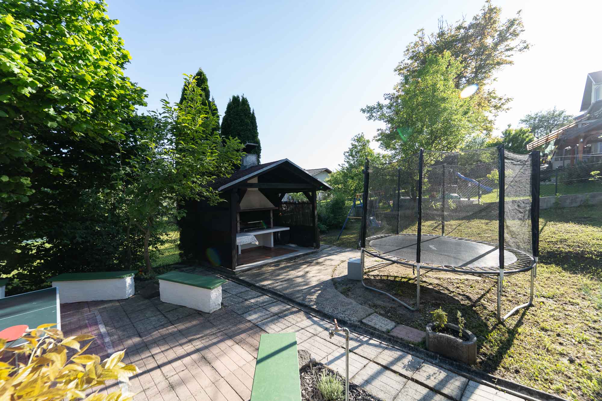 Family Fun nudi moderno uređen interijer te prostranu natkrivenu terasu u zelenilu s velikim stolom, roštiljem… Za djecu smo priredili trampolin, ljuljačke, stolni tenispikado.