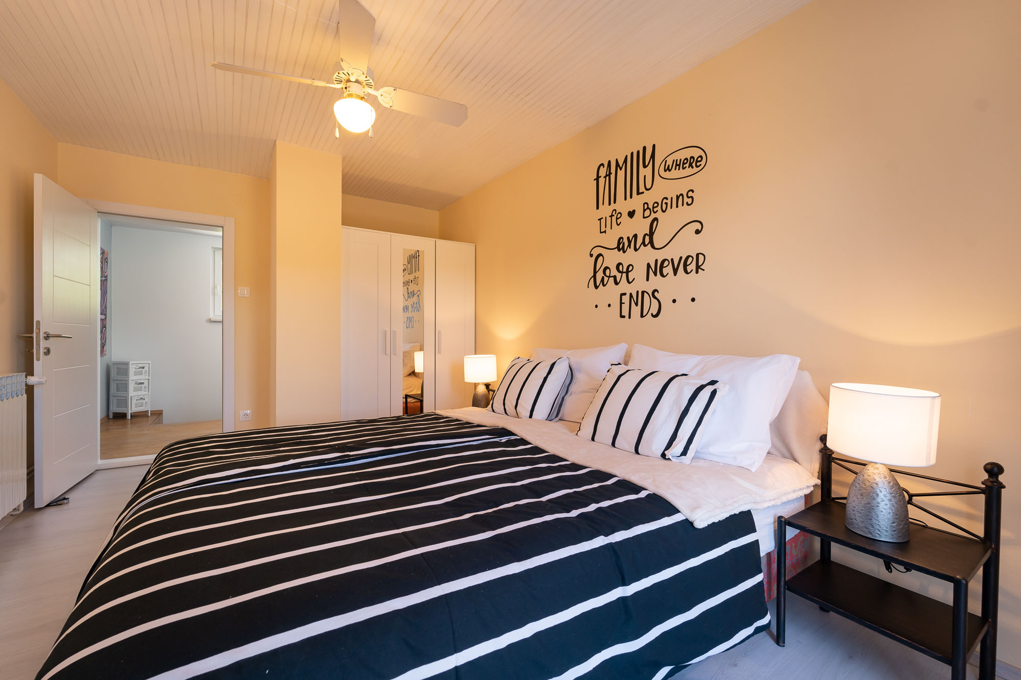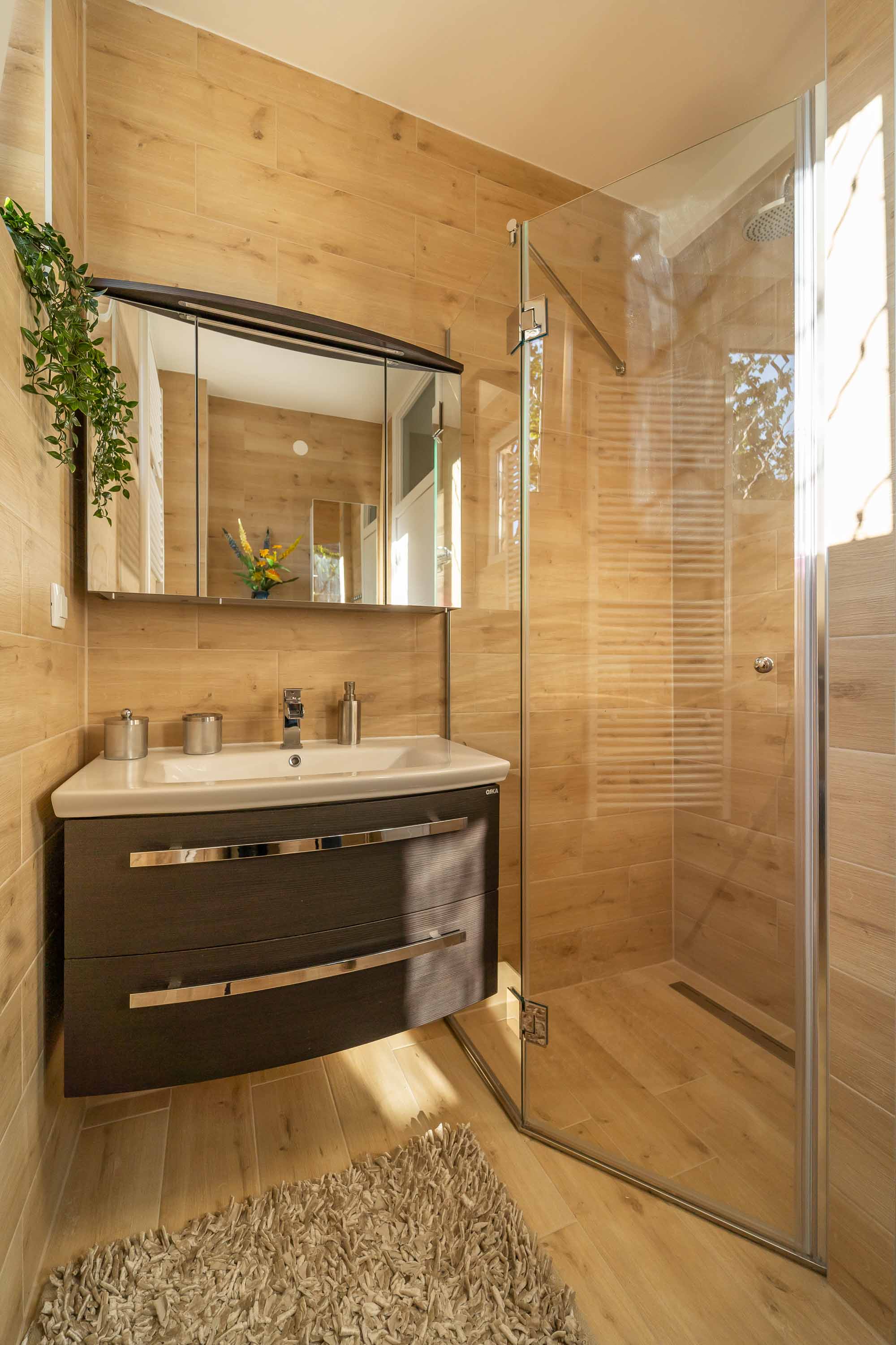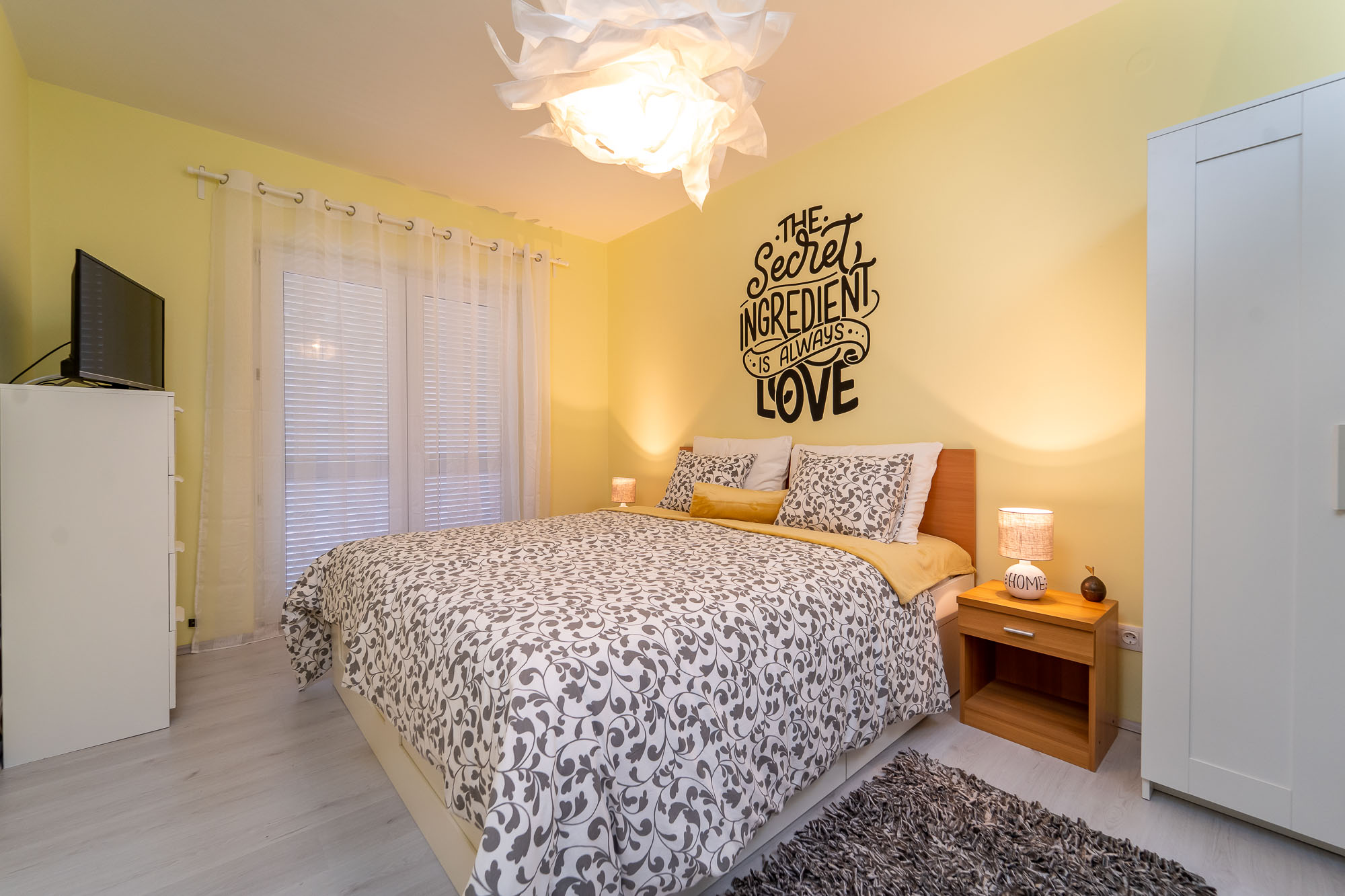 Interijer se sastoji od 4 velike spavaće sobe, 2 kupaone i odvojenim dodatnim toaletom. 3 sobe su sa bračnim krevetima (180x200 cm) a jedna spavaća soba ima 2 odvojena kreveta (svaki 90x200 cm). Kompletno opremljena kuhinja spojena je s blagavaonom i velikim dnevnim boravkom.