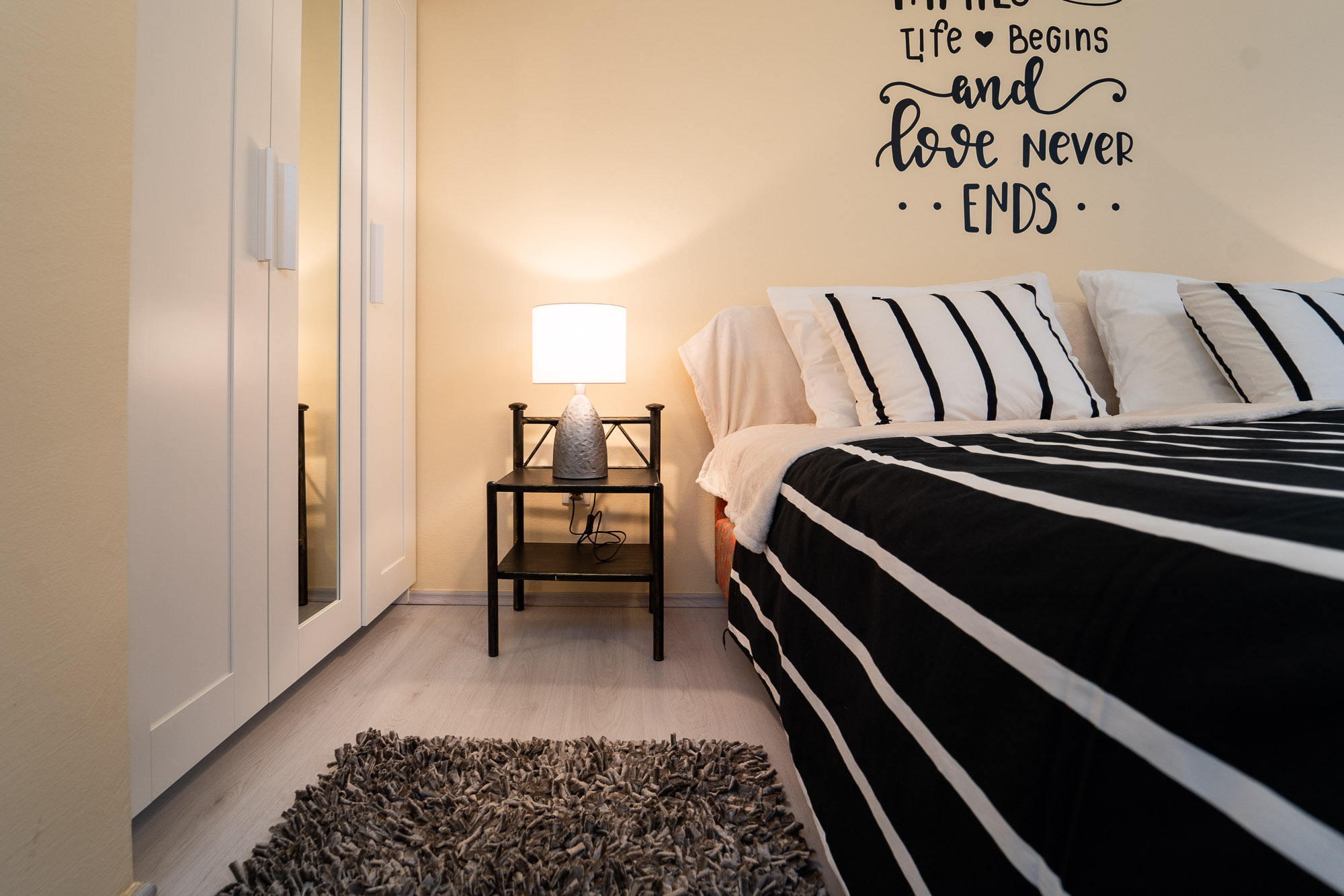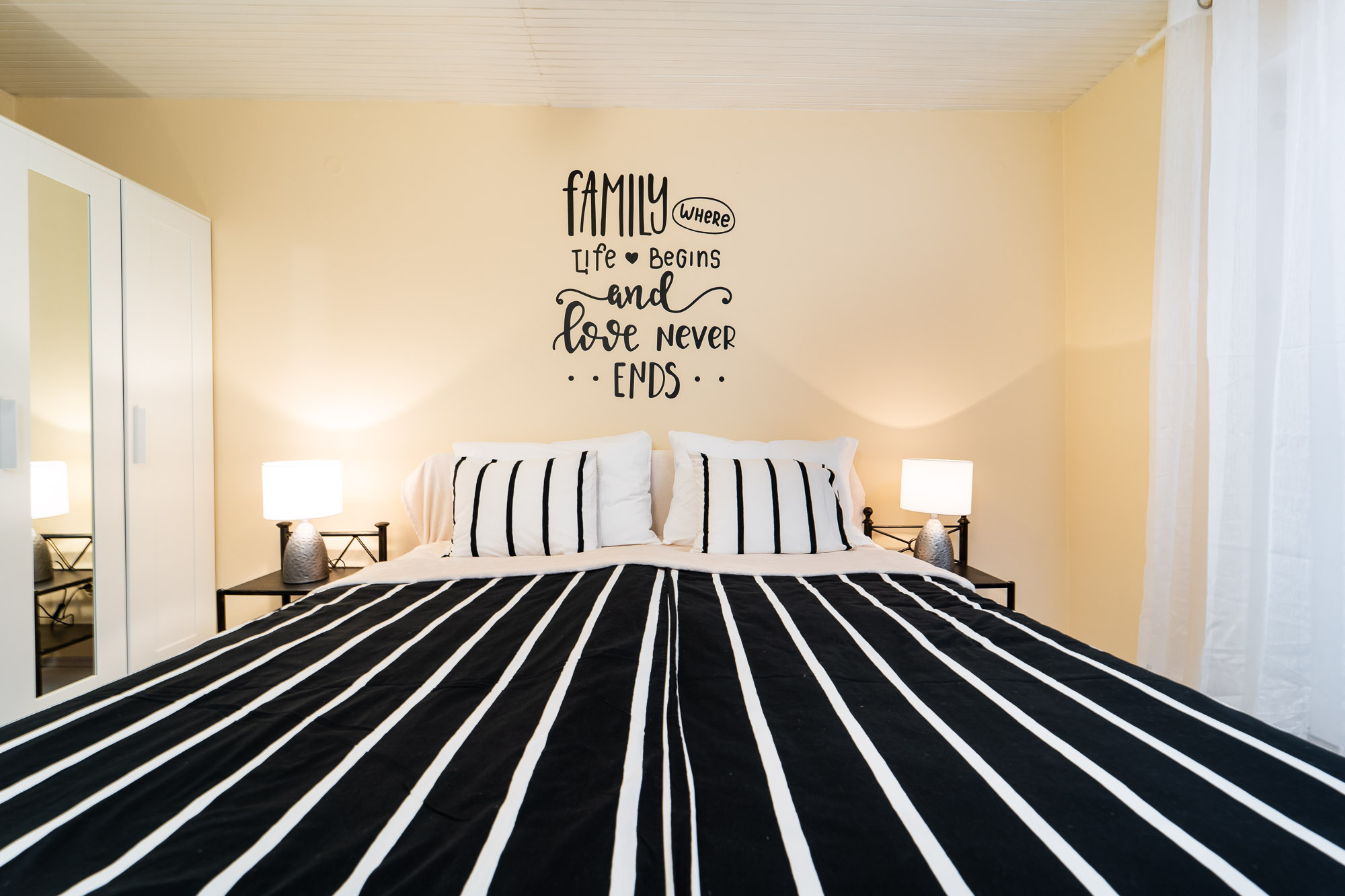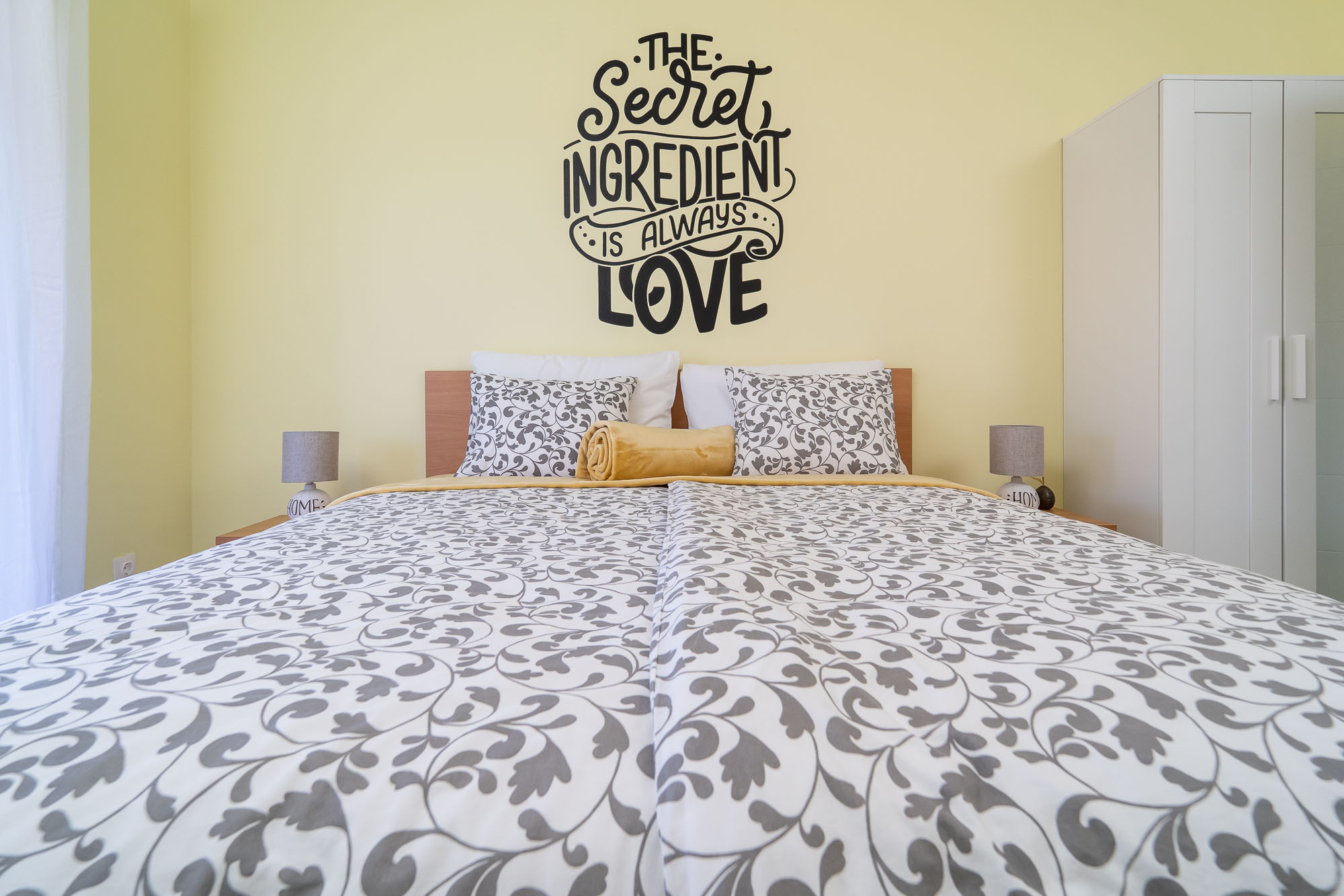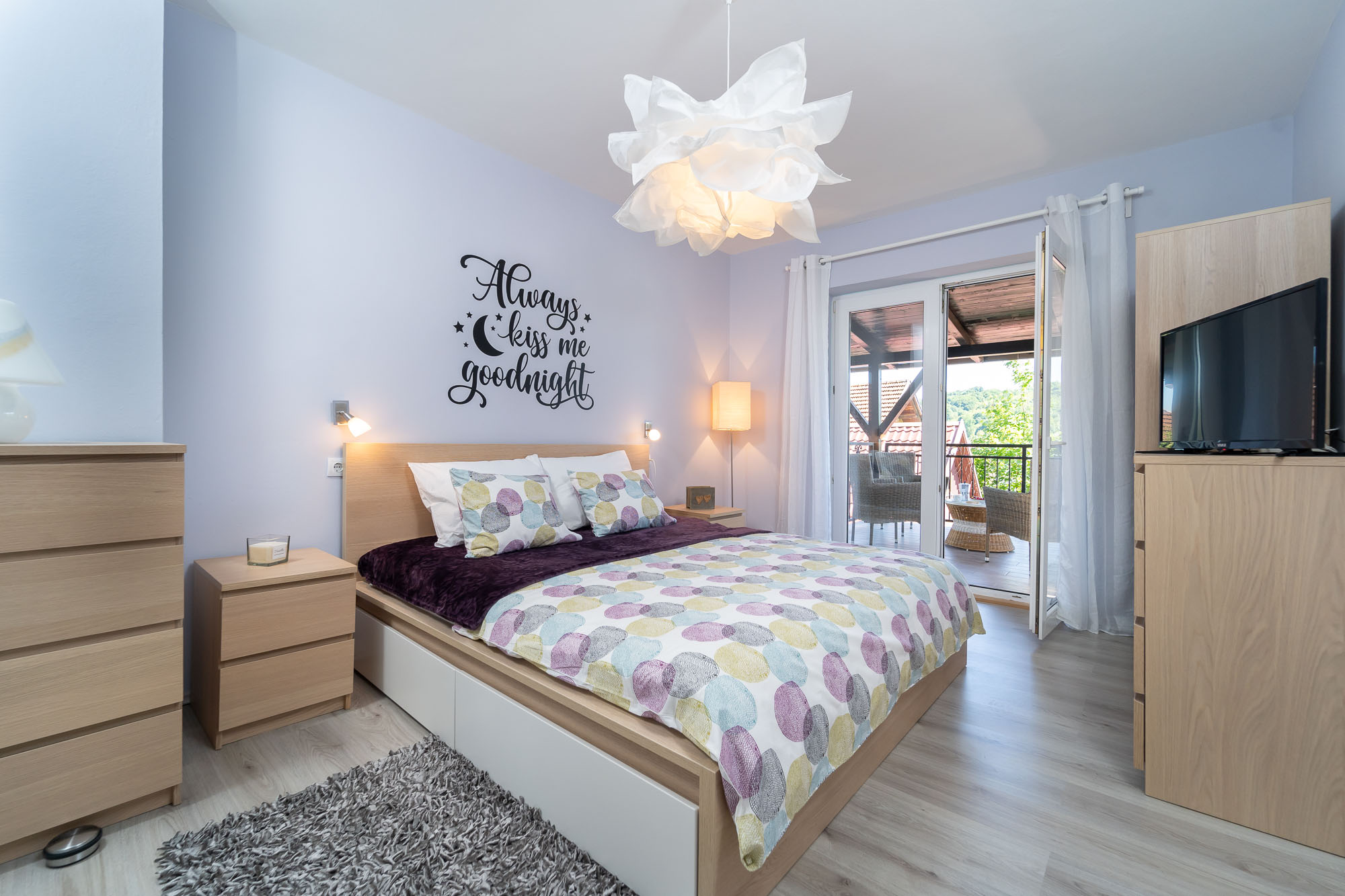 Interijer se sastoji od 4 velike spavaće sobe, 2 kupaone i odvojenim dodatnim toaletom. 3 sobe su sa bračnim krevetima (180x200 cm) a jedna spavaća soba ima 2 odvojena kreveta (svaki 90x200 cm). Kompletno opremljena kuhinja spojena je s blagavaonom i velikim dnevnim boravkom.